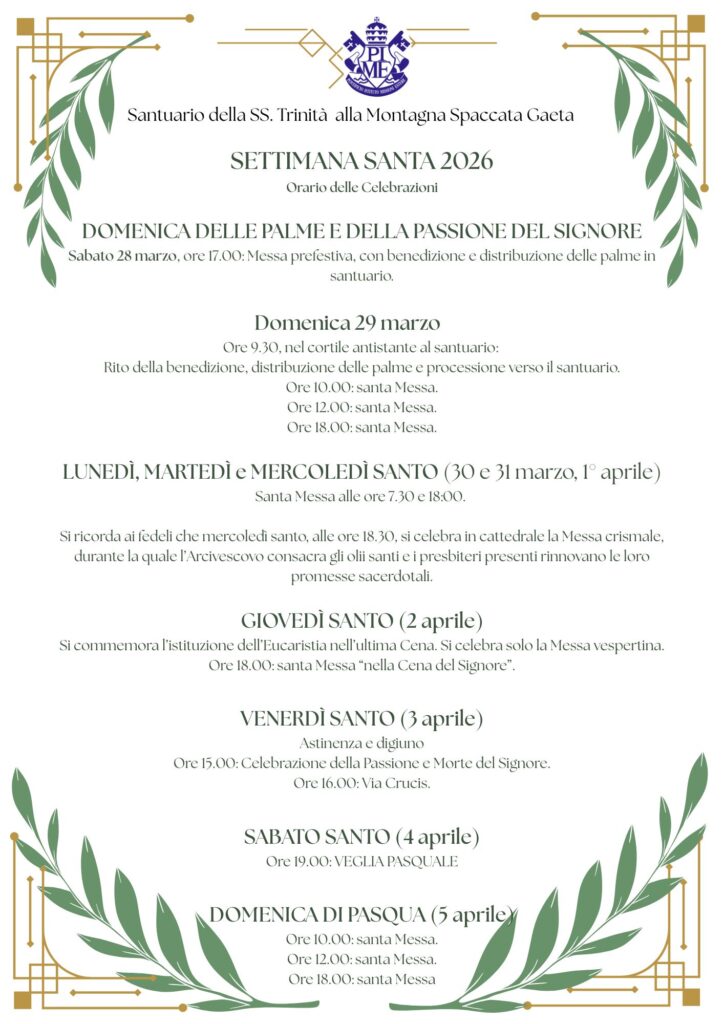 La Settimana Santa è il cuore dell’anno liturgico, il tempo in cui la nostra comunità è chiamata a rivivere insieme il mistero della Passione, Morte e Risurrezione del Signore. Vi invitiamo a partecipare alle celebrazioni in santuario: ogni momento è un’occasione preziosa per fermarsi, pregare e rinnovare la propria fede.